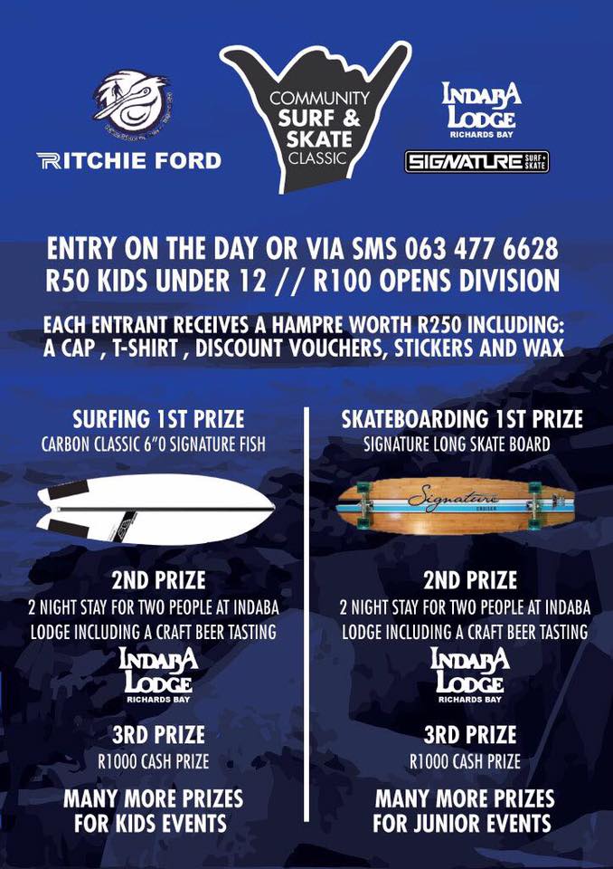 The event is open to all ages and skill levels, and to top it off you can win some awesome prizes sponsored by Signature Surf & Skate, Indaba Lodge and Ritchie Ford. The prizes are as follows: