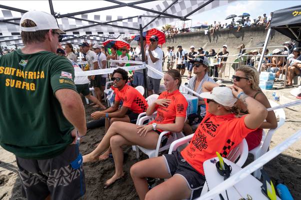 The Silver Medal winning South African squad wait in their ‘box’ while Jordy Smith is surfing in the final of the ISA Aloha Cup at the ISA World Surfing Games presented by Vans at Myazaki in Japan